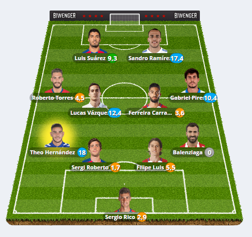 Esta nueva táctica casi nos funciona pero a falta de pocas jornadas nuestro rival, que tenía a Luis Suárez, nos adelantó y ganó el Comunio. Si observas su alineación, podrás ver esos jugadores con proyección de los que te hablábamos (Sandro, Theo, Lucas Vázquez). Además tenía en segunda fila a Benzema y Modric.