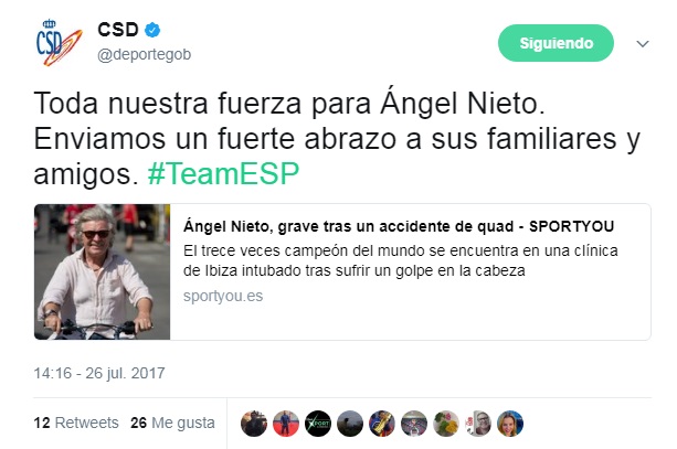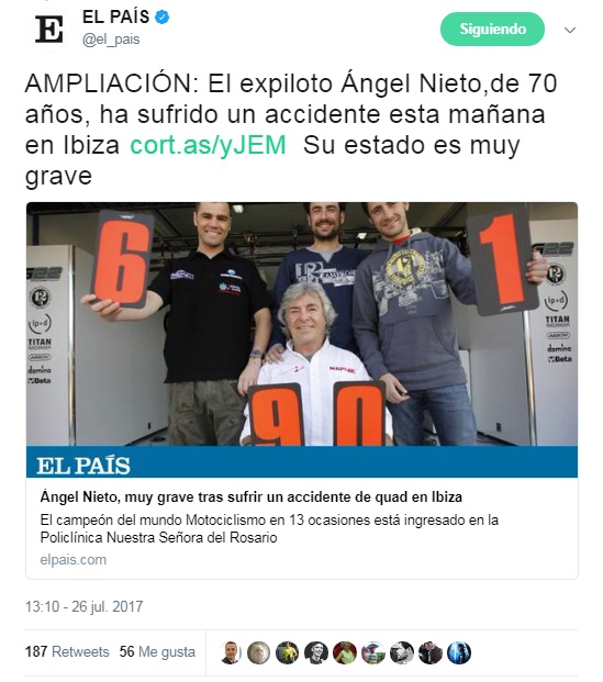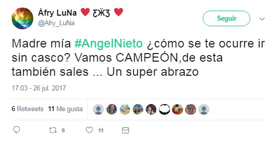 Las muestras de apoya en twitter no se han hecho esperar. Te mostramos una pequeña muestra de los mensajes que han dejado en Twitter a raíz del trágico accidente de Ángel Nieto.